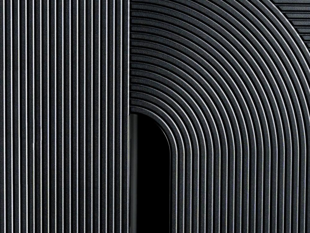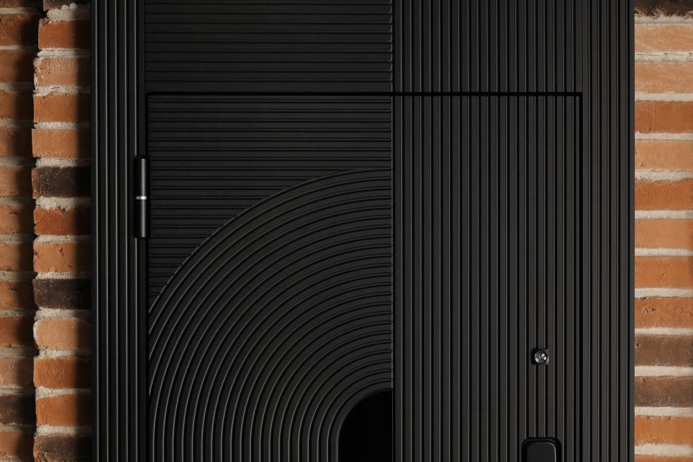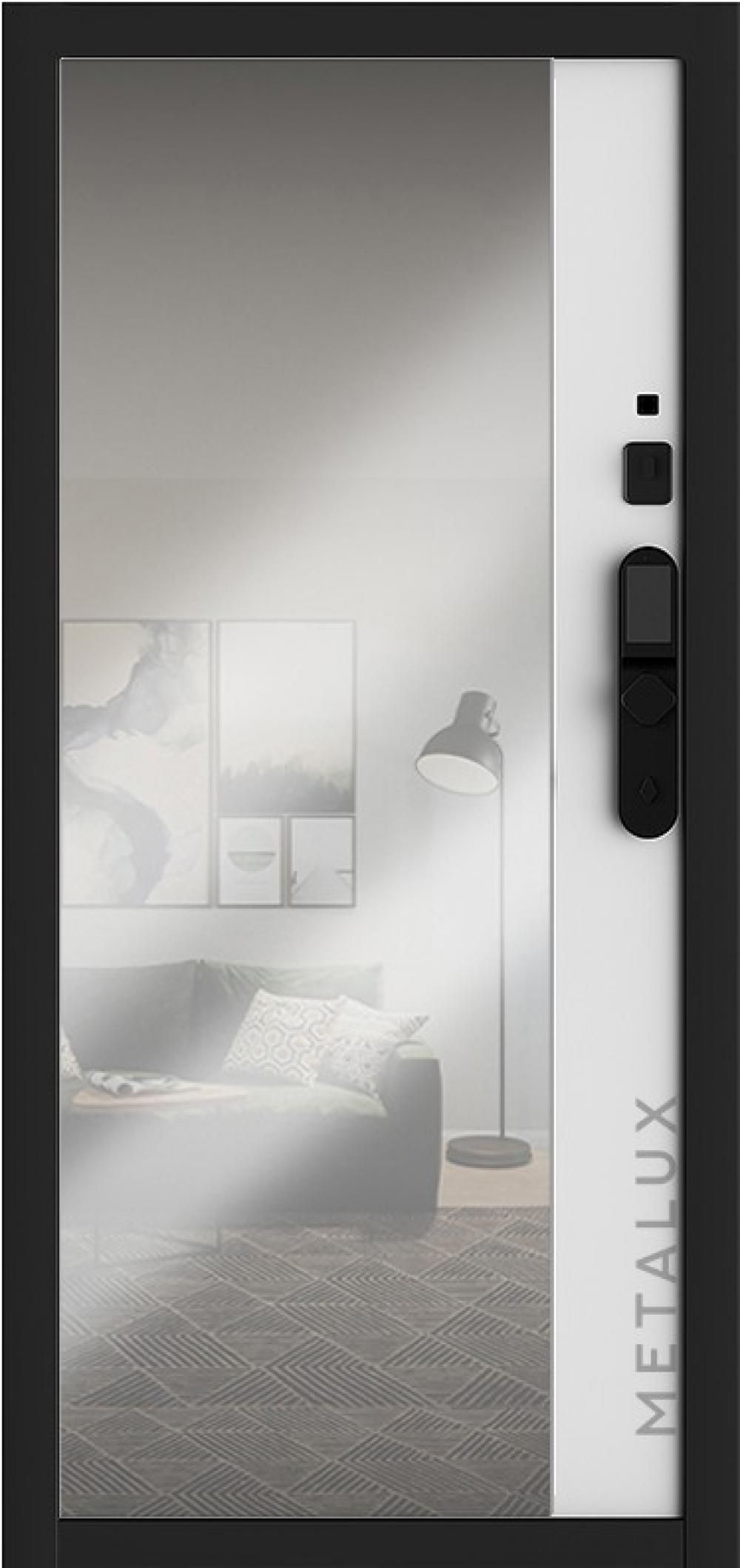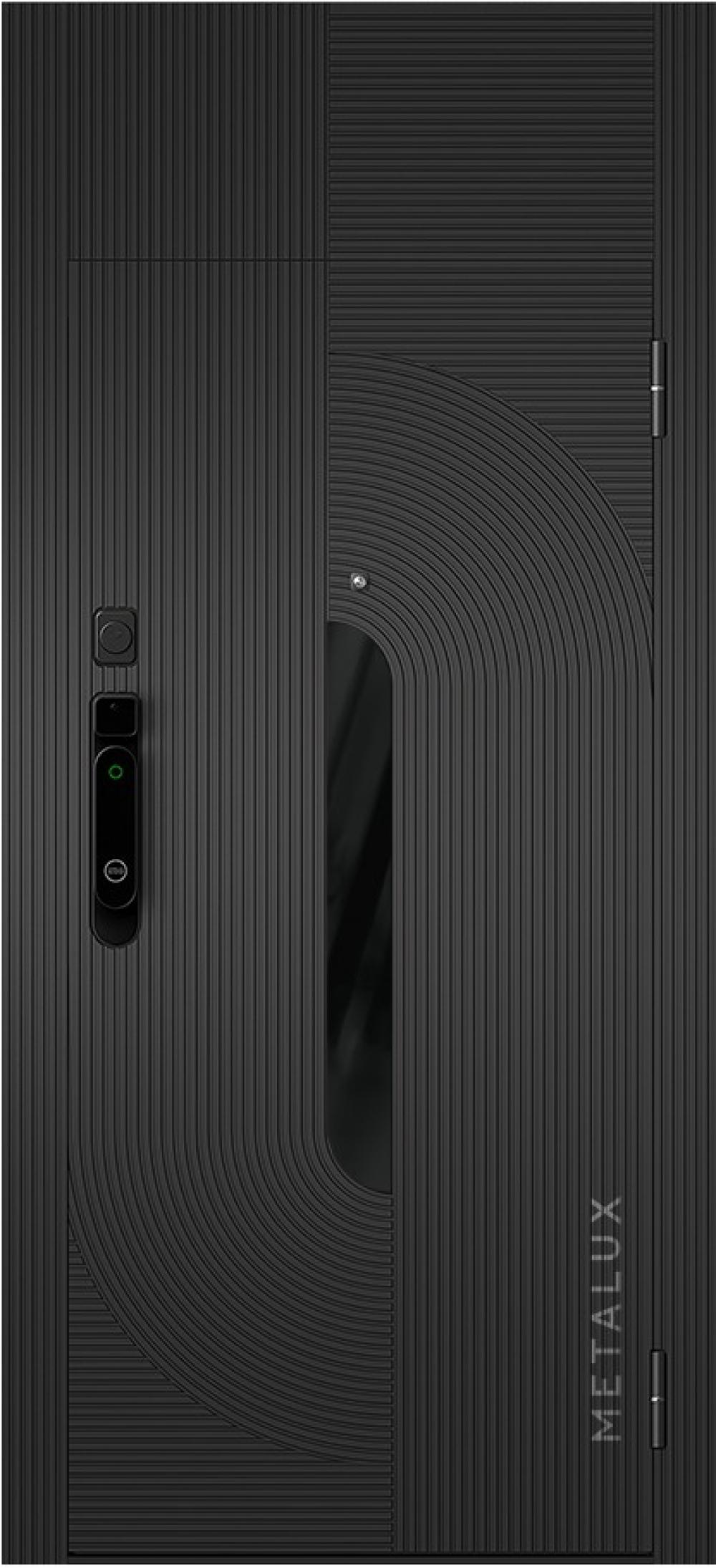 Снаружи полотно отделано МДФ панелью 16 мм, пленка №97, цвет «Черный», вставка из черного глянцевого стекла.